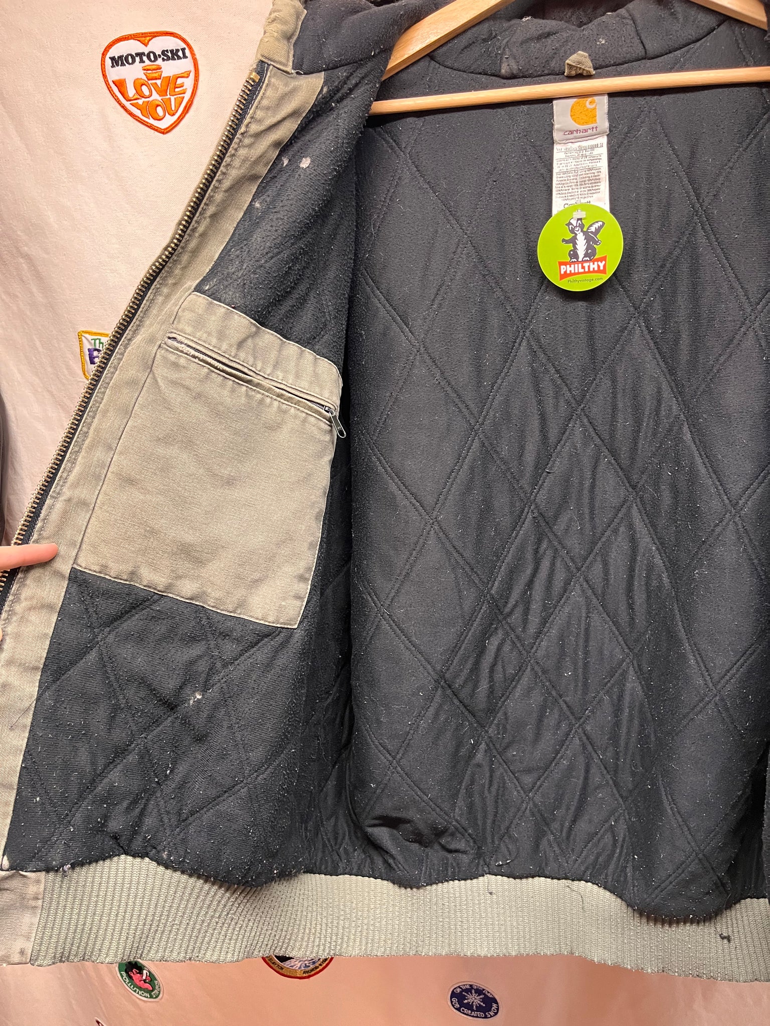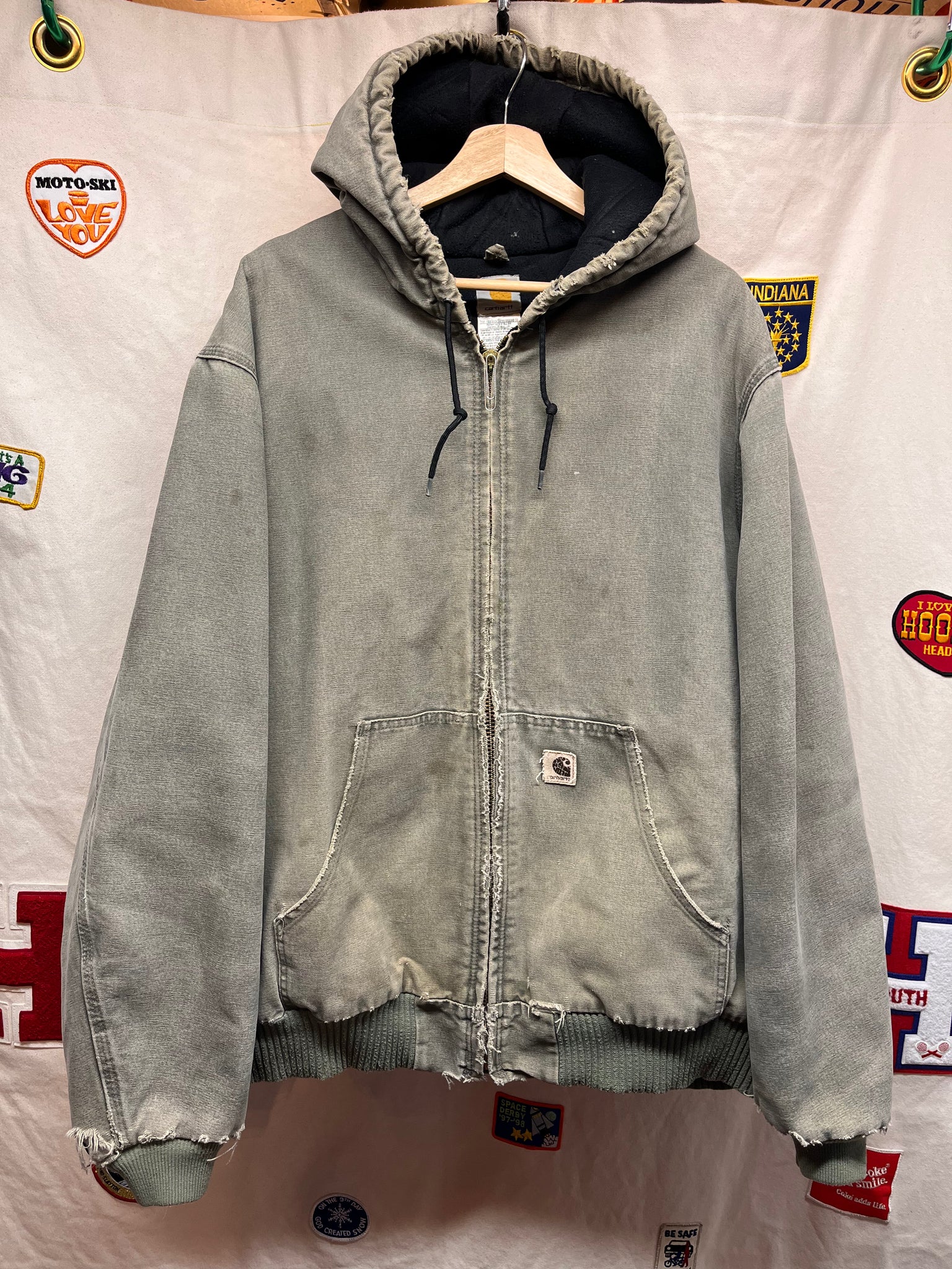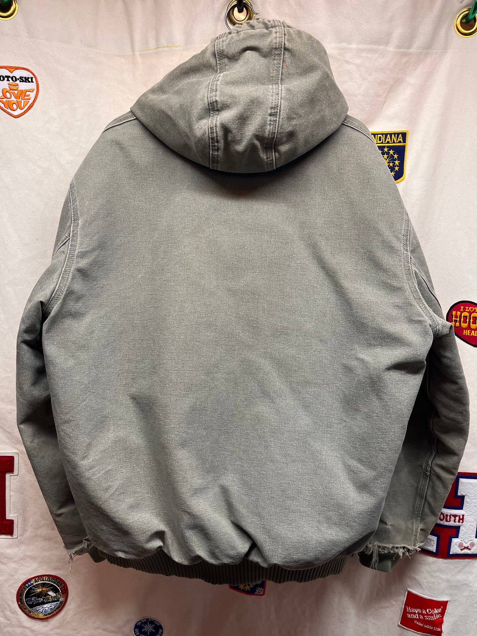 Vintage Carhartt J142 Grey Hooded Distressed Canvas Zip-Up Jacket: XL Tall